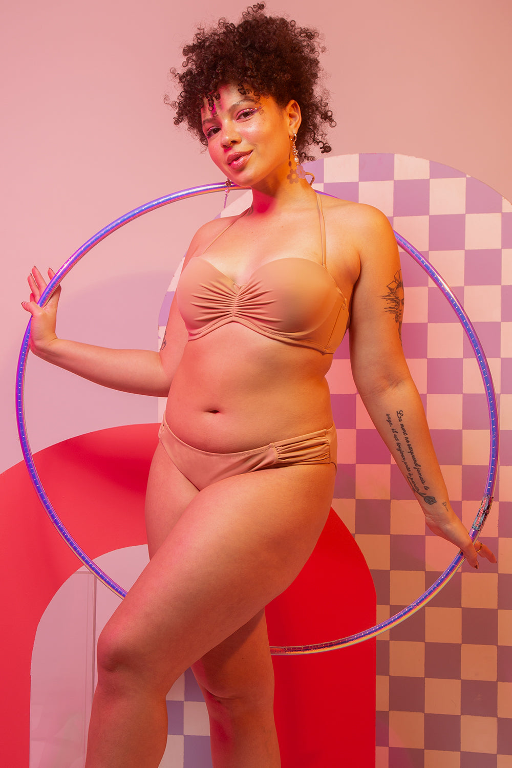 - Halter top bikini has a necktie for customizable lift. Tighten ties for added lift.